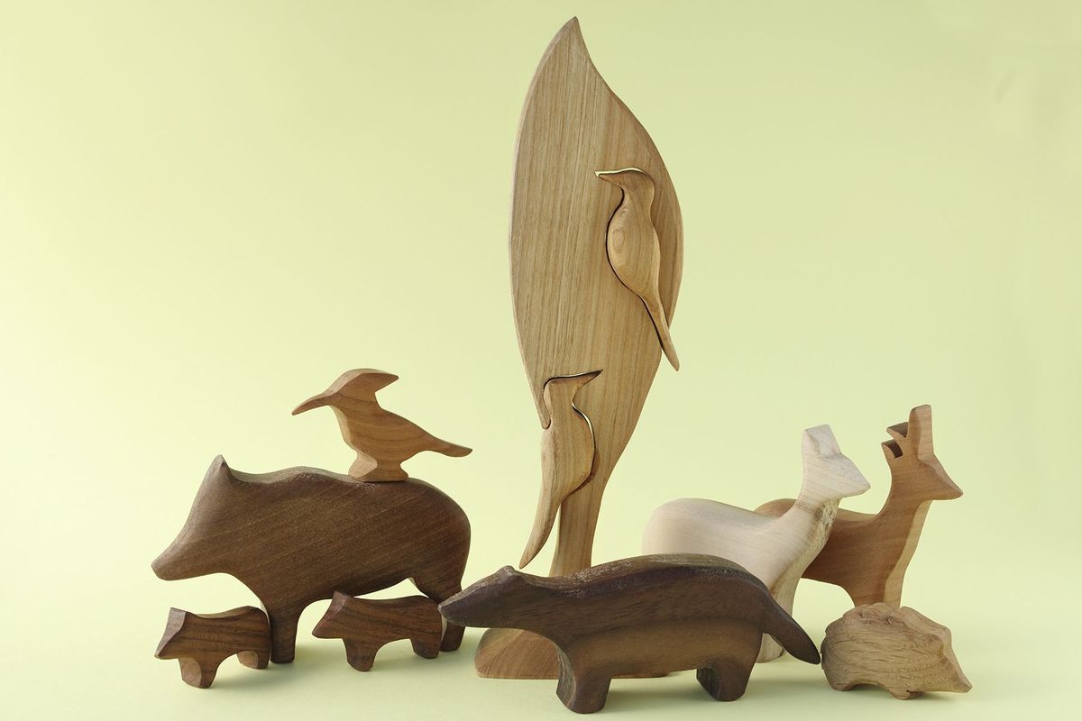 1 arbre à pics, 1 chevreuil, 1 chevrette, 1 sanglier avec ses deux marcassins, 1 blaireau, 1 huppe et 1 hérisson en essences variées, choisies pour vous par l’artisan