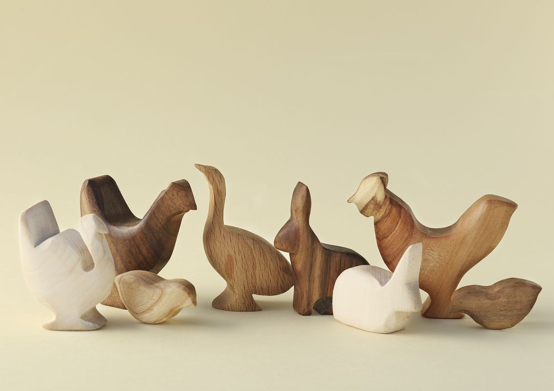 1 coq, 1 poule, 2 poussins, 1 dindon, 1 oie, 1 lapin assis, 1 lapin couché en essences de bois diverses, choisies pour vous par l’artisan.