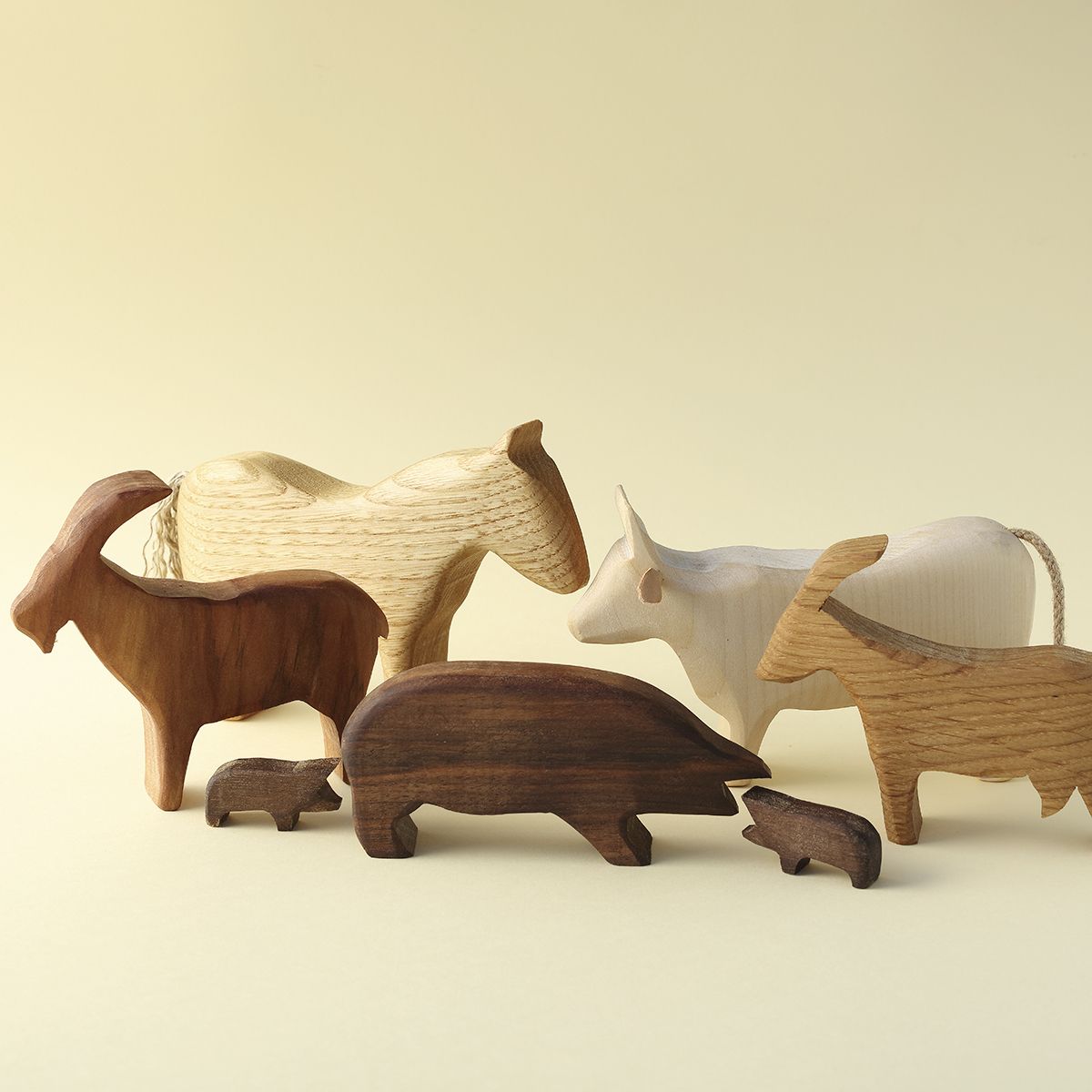 1 vache, 1 cheval de trait, 1 bouc, 1 chèvre, 1 cochon et ses quatre petits en essences variées, choisies pour vous par l’artisan